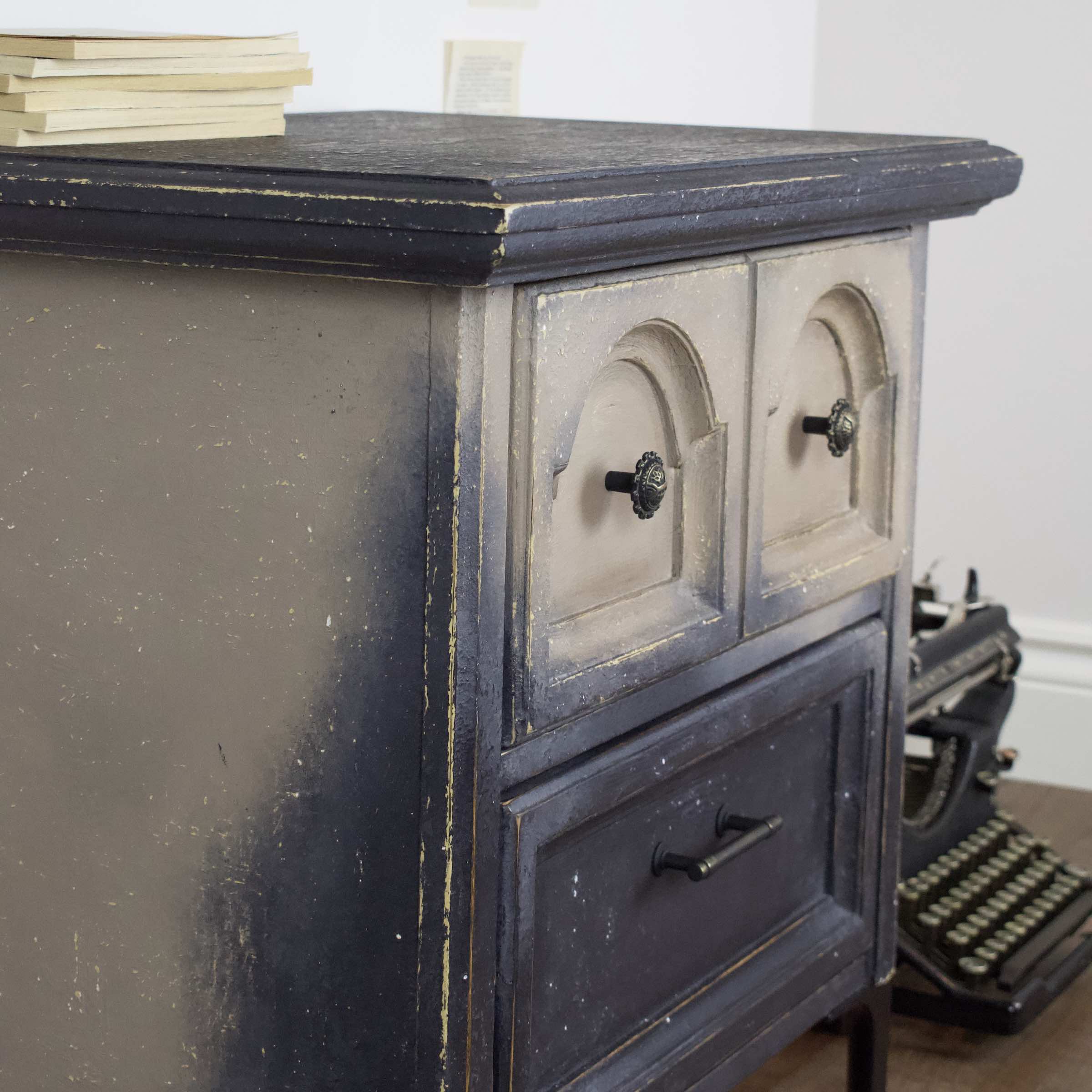Ce meuble d’appoint est à la base en bois et en très bon état (de marque Gérard Collin), des années 1980; texturé, peint de couleur sable et noir qui se fondent ensemble… le jaune du désert du Mojave au soleil refait surface par pétillements. Le tout recouvert de cire.